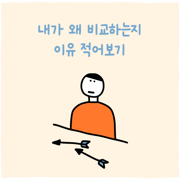 내가 왜 비교하는지 이유 적어보기 비교로부터 자유로워지기 위한 첫걸음은 내가 왜 비교하는지 그 이유를 들여다보는 거예요. 이번 주에는 내가 비교하는 순간을 포착해서 그 이유를 적어보는 연습을 해봐요. 누군가와 나를 비교하는 순간이 왔을 때, 노트를 펴고 이렇게 적어보세요. "나는 지금 무엇을 비교하고 있지?", "이 비교를 통해 내가 진짜 원하는 건 무엇일까?", "이 비교 뒤에 숨어있는 나의 두려움이나 욕구는 무엇인가?" 친구의 승진을 부러워했을 때, 어쩌면 내가 진짜 원하는 건 승진 자체가 아니라 인정받고 싶은 마음일 수 있어요. 누군가의 가족 여행 사진을 보고 비교하게 된다면, 어쩌면 내가 원하는 건 여행이 아니라 가족 간의 단란한 시간일 수 있죠. 비교의 이유를 알면, 비교에서 벗어나 진짜 내가 원하는 것으로 나아갈 수 있어요. 실천하는 모습을 모두가 볼 수 있도록 SNS에 해시태그 #밑미타임과 함께 올려주세요. 오늘 #밑미타임에 대한 생각과 경험을 이 글의 댓글로 함께 나눠주셔도 좋아요!